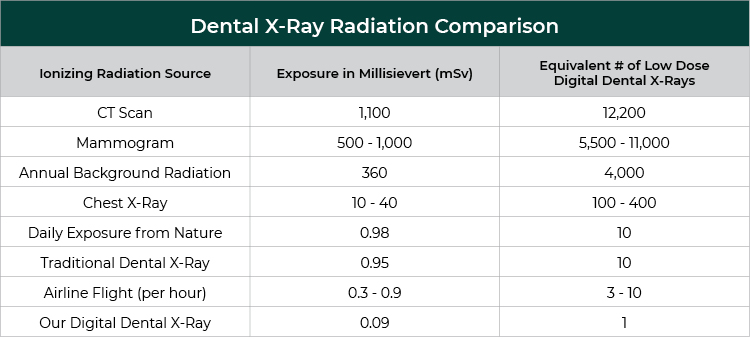 X-rays allow the dentist to see cavities in-between teeth that cannot be seen with a visual exam. X-rays also allow the dentist to see any changes in bone that supprts the teeth. X-rays are crucial to exposing hidden decay, revealing abscesses, cysts, and tumors. They aid in the identifying bone loss from periodontal disease, locating tarter, and evaluating the condition of crowns, fillings, and other restorations. Modern dental x-ray equipment (digital x-ray) use very low levels of radiation. In fact, everyday on average we are exposed to more natural radiation than a series of dental x-rays. Most medical x-rays range from 1000-10,000 times more exposure than digital dental x-rays. See the chart below for a radiation exposure comparison.